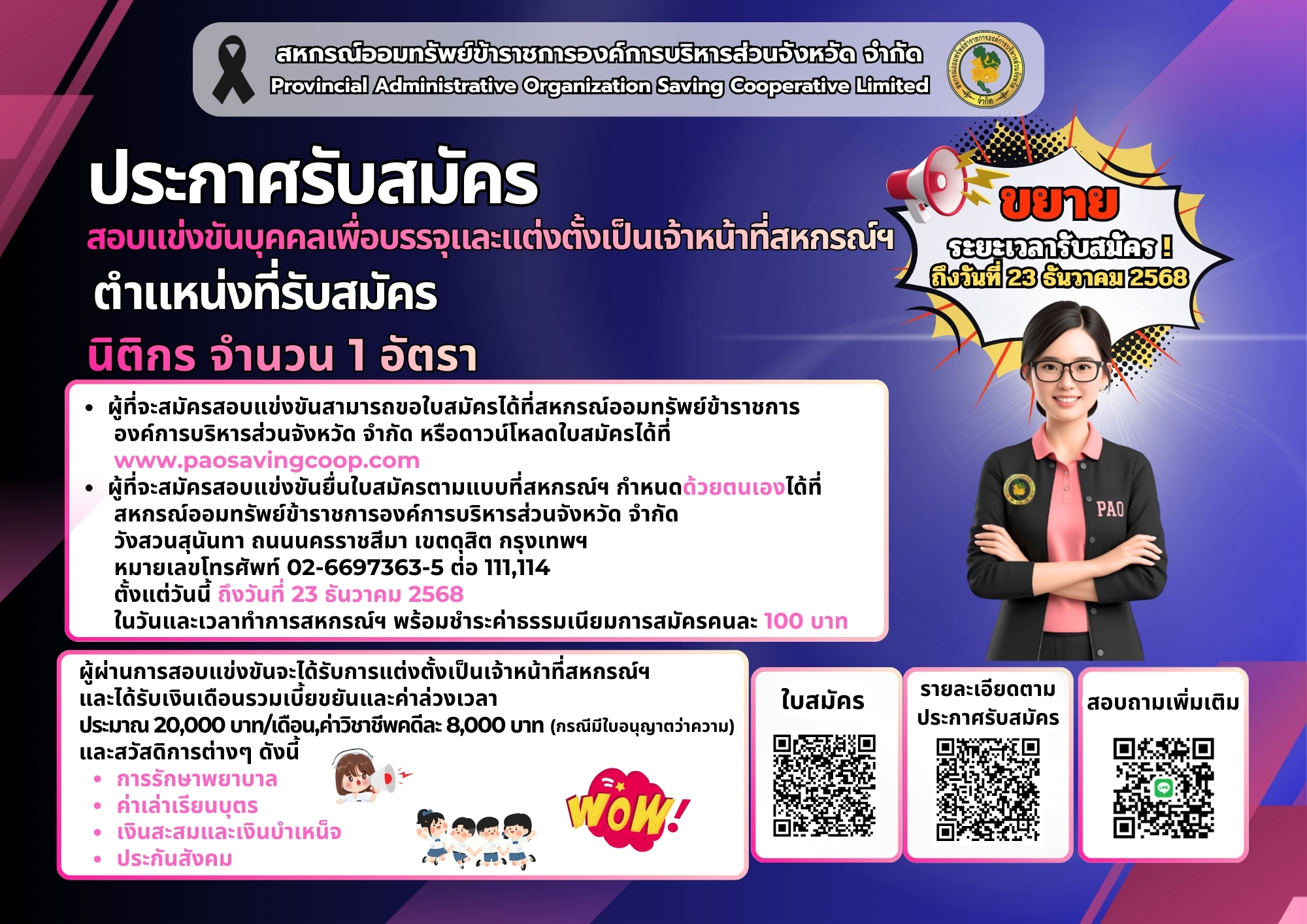 ประกาศรับสมัครตำแหน่งนิติกร จำนวน 1 อัตราประกาศรับสมัคร บรรจุแต่งตั้งเป็นเจ้าหน้าที่สหกรณ์ฯ ตำแหน่งนิติกร 1 อัตรา...