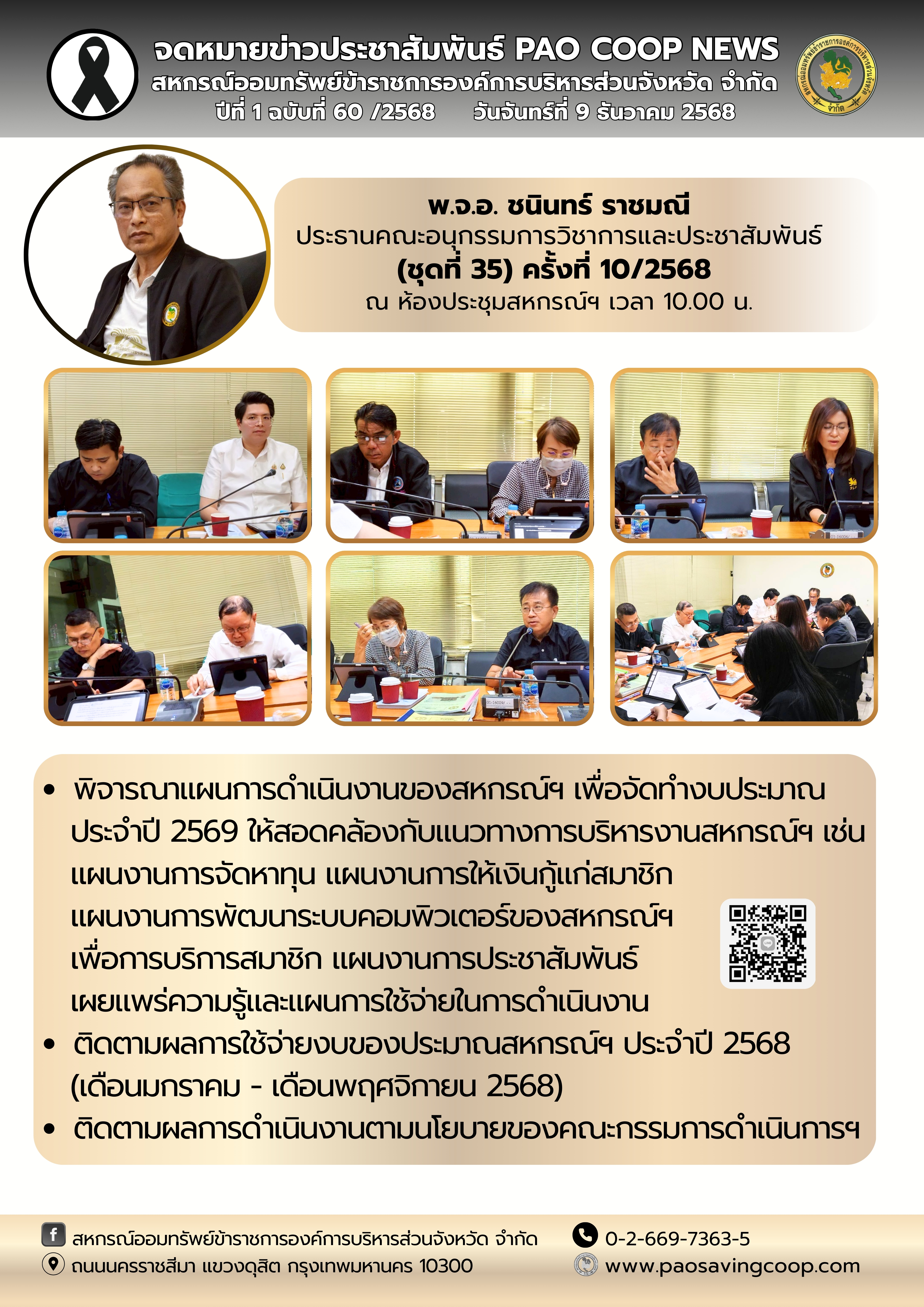 การประชุมคณะอนุกรรมการวิชาการและประชาสัมพันธ์ ฉบับที่ 60 ประจำวันจันทร์ที่ 9 ธันวาคม 2568...