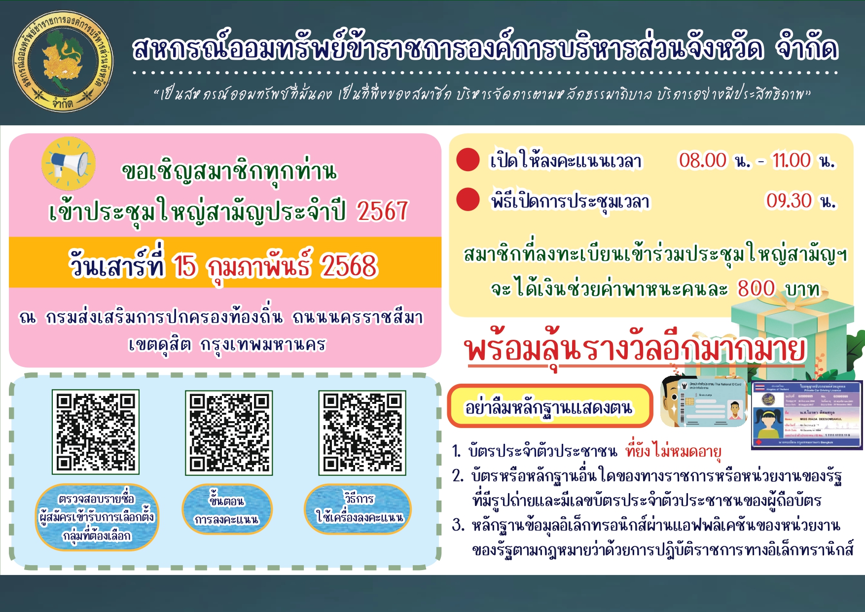 แจ้งกำหนดการประชุมใหญสามัญประจำปี 2567 และแบบตอบรับจำนวนสมาชิกที่จะเข้าร่วมประชุม ขั้นตอนการใช้เครื่องลงคะแนนเลือกตั้ง และขั้นตอนการลงคะแนนเลือกตั้ง...