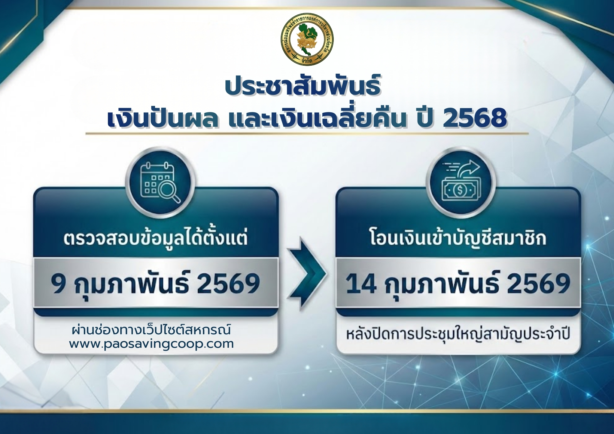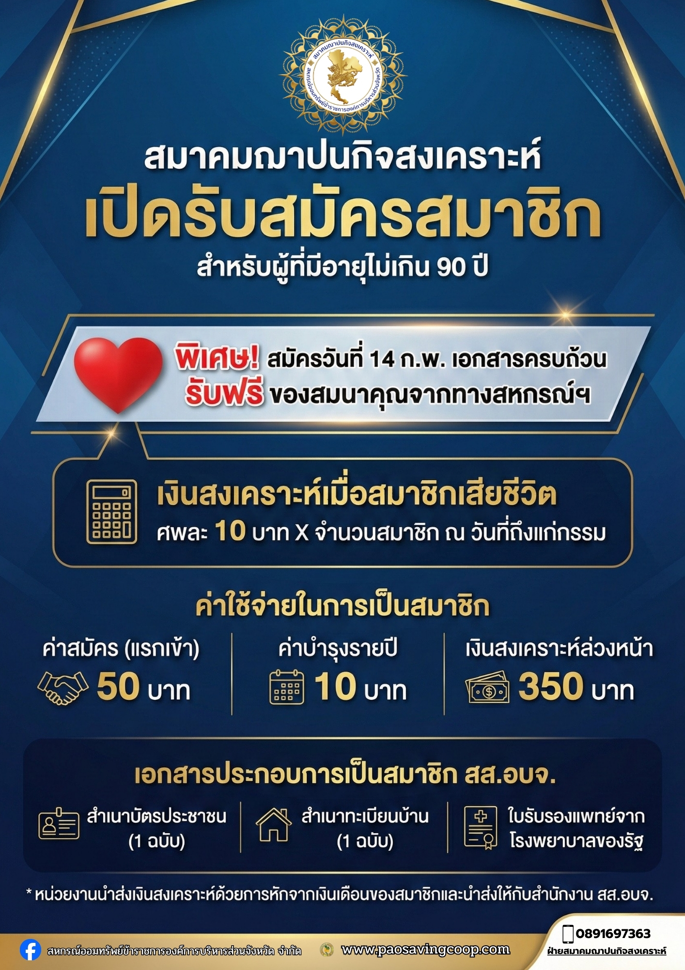 เชิญชวนสมาชิกสมัครเข้าร่วมเป็นสมาชิกสมาคมฌาปนกิจสงเคราะห์ และโครงการเงินกู้สามัญเพื่อสมาชิกสหกรณ์ที่เป็นสมาชิกสมาคมฌาปนกิจสงเคราะห์สหกรณ์ฯ...