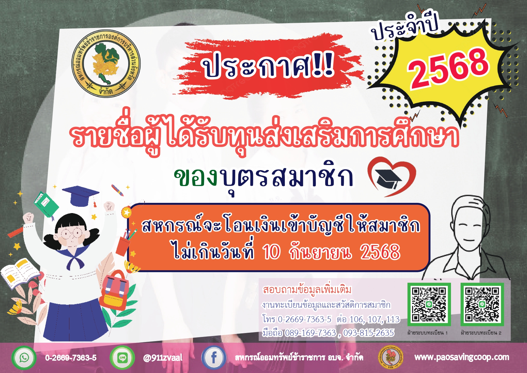 รายชื่อผู้ได้รับทุนส่งเสริมการศึกษาของบุตรสมาชิก ประจำปี 2568