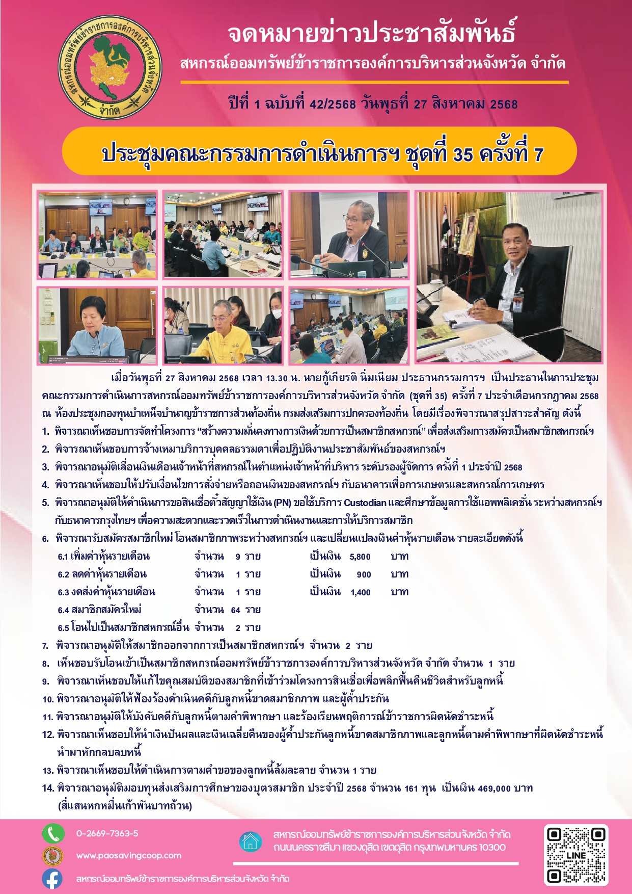 จดหมายข่าวประชาสัมพันธ์ ปีที่ 1 ฉบับที่ 42/2568 วันพุธที่ 27 สิงหาคม 2568