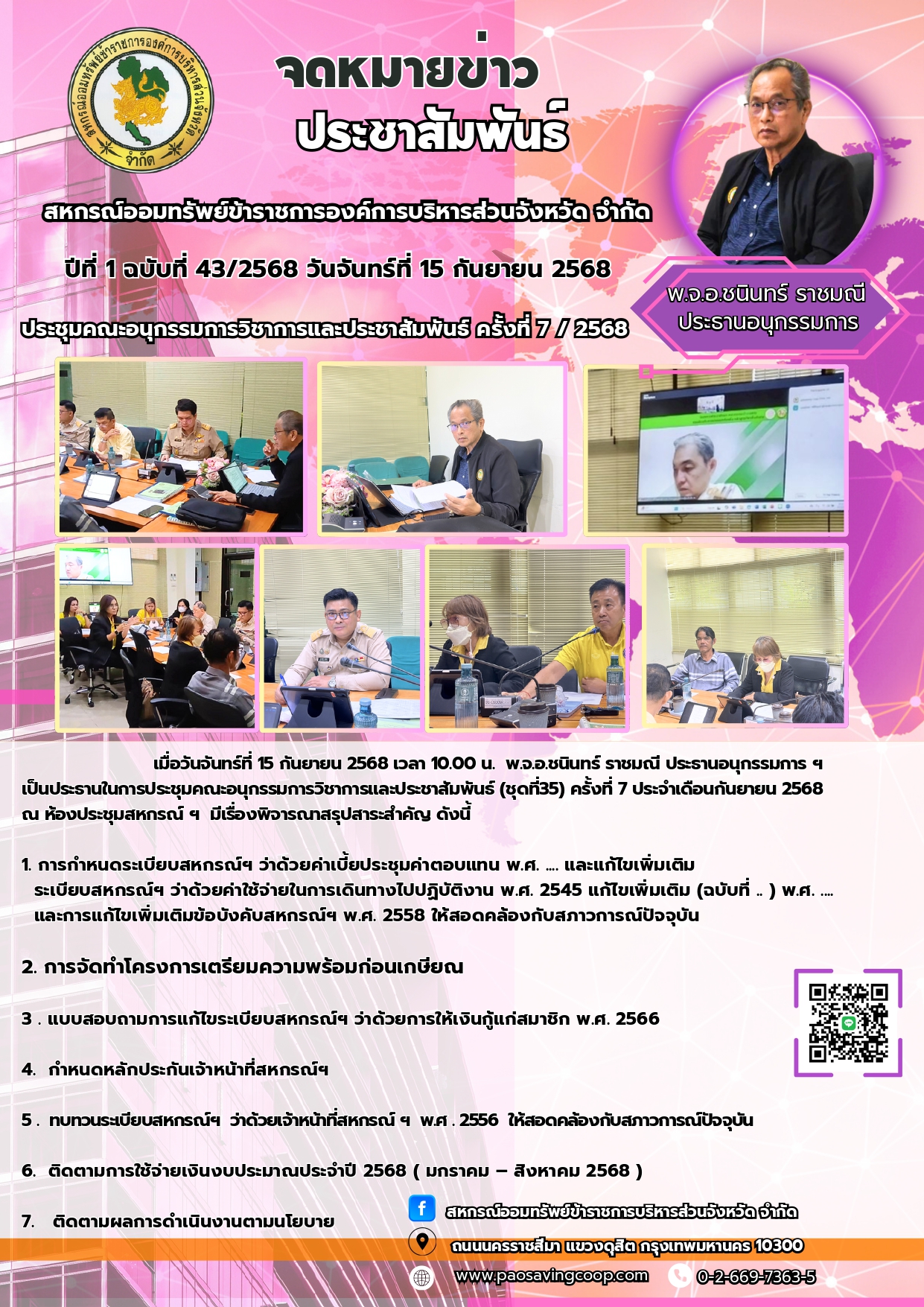 ปีที่ 1 ฉบับที่ 43/2568 วันจันทร์ที่ 15 กันยายน 2568