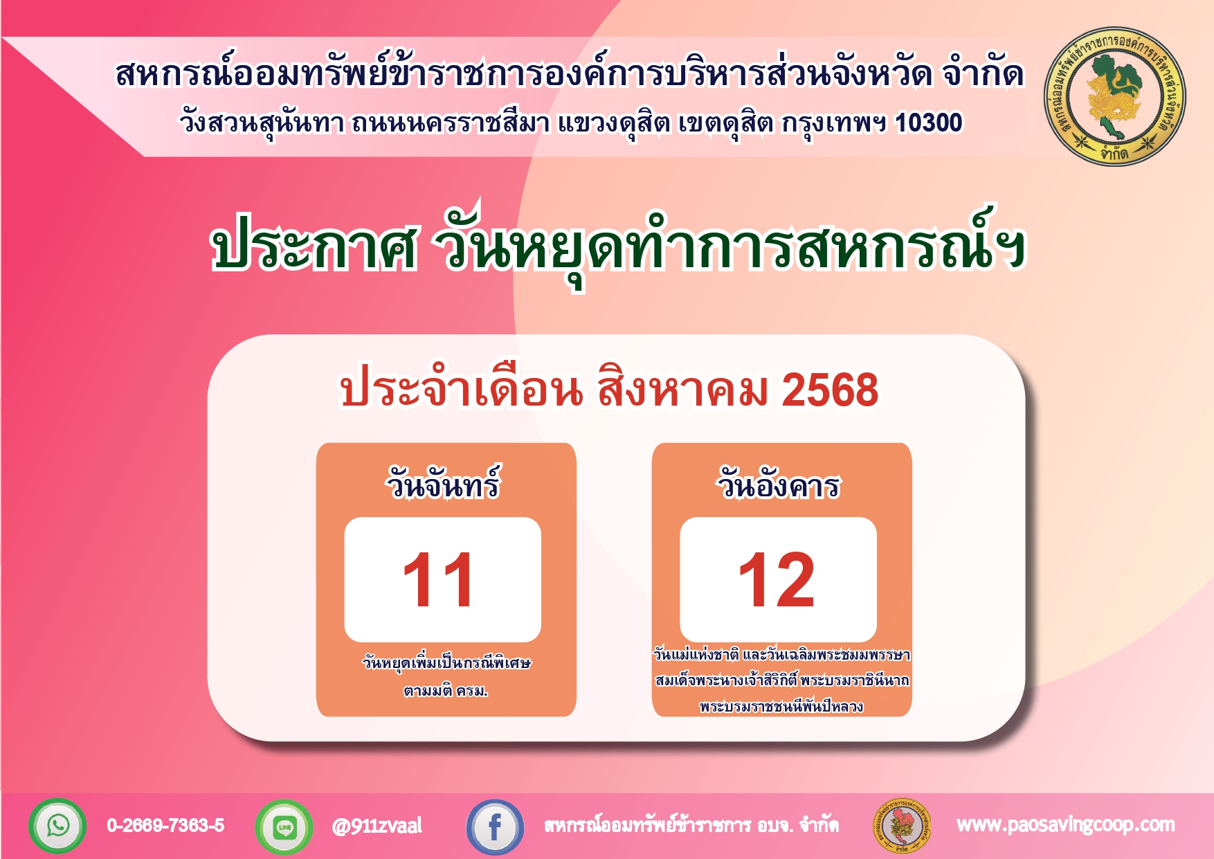 วันหยุดทำการสหกรณ์ฯ ประจำเดือนสิงหาคม 2568
