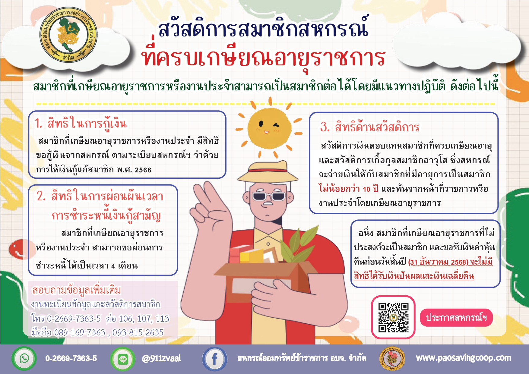 สมาชิกสหกรณ์ฯ เกษียณอายุราชการ และมีสิทธิได้รับสวัสดิการ