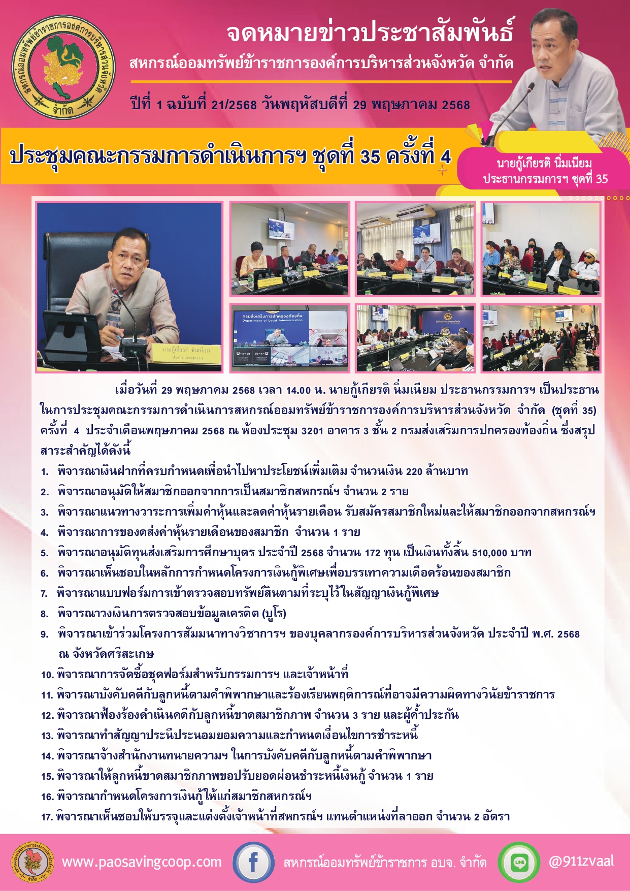 จดหมายข่าวประชาสัมพันธ์ ปีที่ 1 ฉบับที่ 21/2568 วันพฤหัสบดีที่ 29 พฤษภาคม 2568